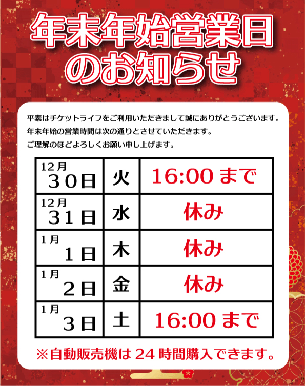 年末年始の有人店舗営業時間は下記のようになります。