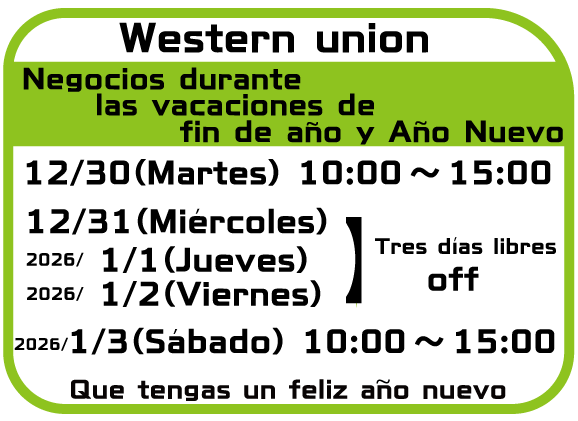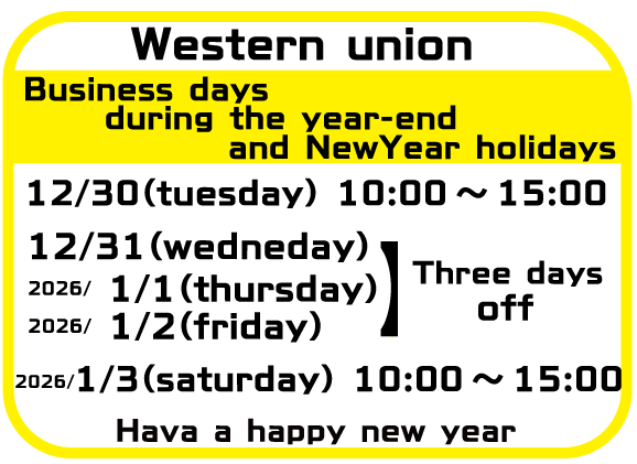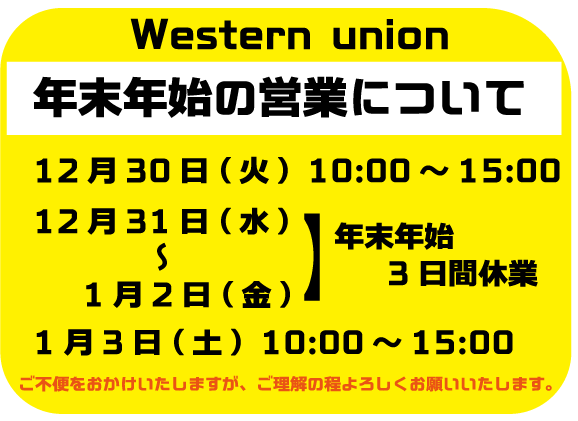 チケットライフ本店にて行っているWestern Union(海外送金)の年末年始営業時間は下記のようになります。