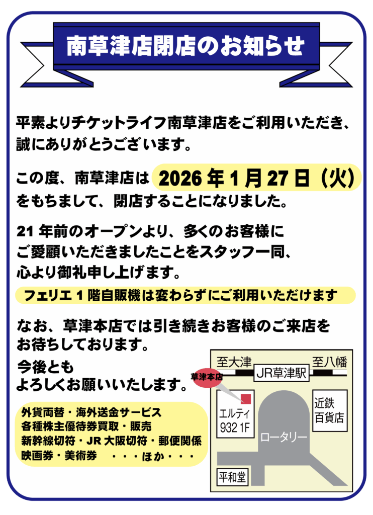 突然ではございますが、チケットライフ南草津店は2026年1月27日(火)をもちまして閉店することとなりました。