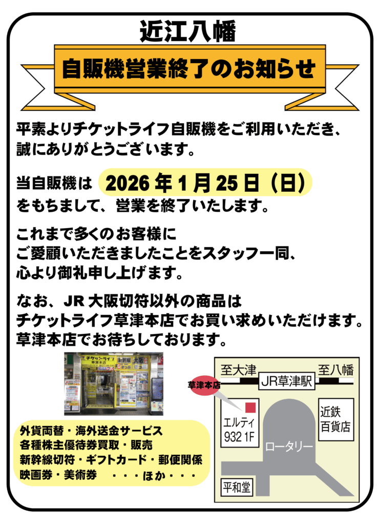 突然ではございますが、チケットライフ近江八幡駅北口自動販売機は2026年1月25日(日)をもちまして閉店することとなりました。